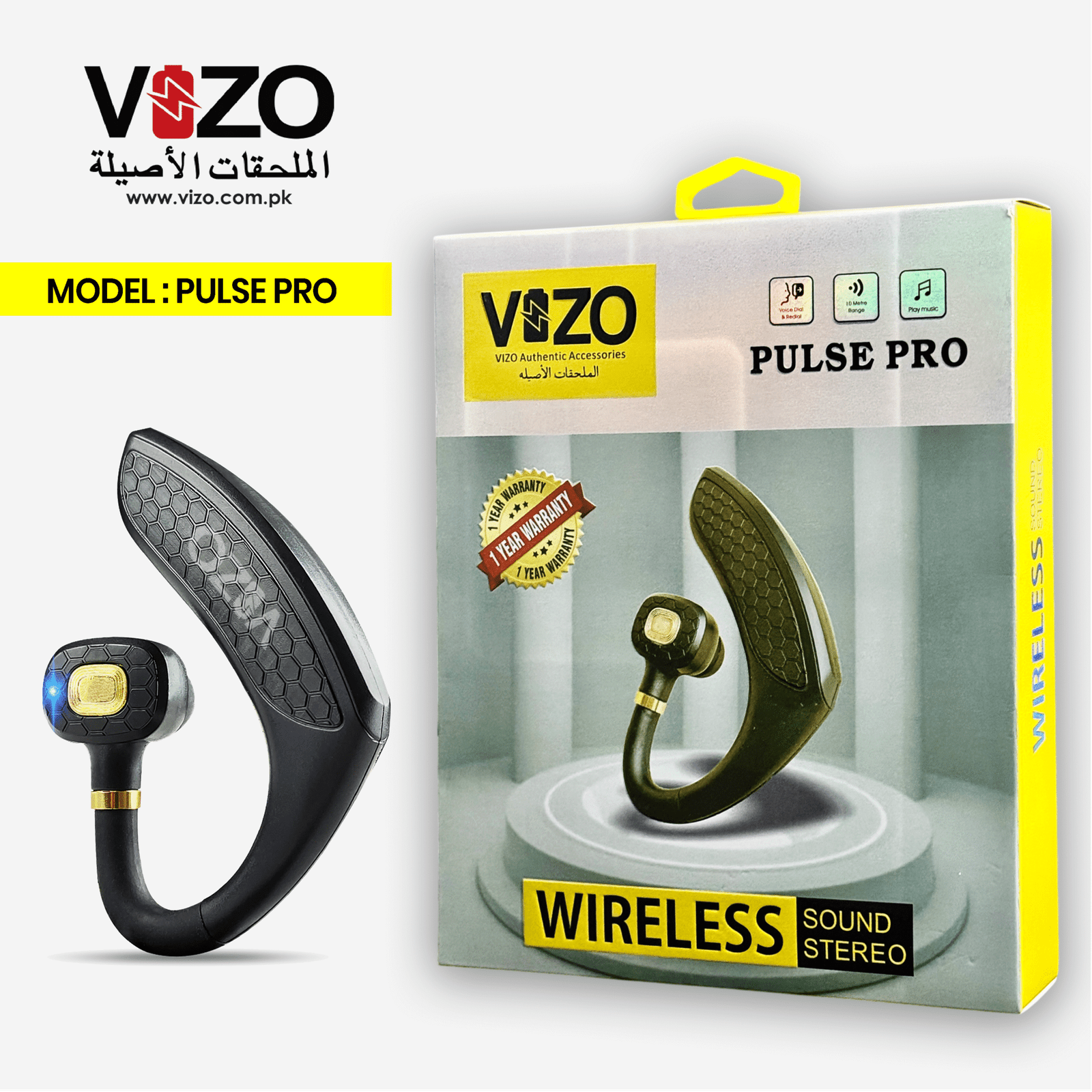 Elegance Experience crystal-clear stereo sound with the Vizo Pulse Pro. Featuring a sophisticated, ergonomic over-ear design and a reliable 10-meter range, this headset is built for those who demand both style and performance. With a 1-year warranty included, it’s the perfect companion for hands-free calls and high-quality music on the go.